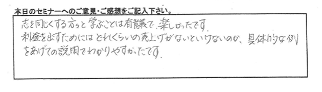 また、「経費がどのくらいかかるか」という質問は多くいただくため、家賃、人件費、原価費、広告費など売上に合わせて、大体の目安のパーセントを指導しています。